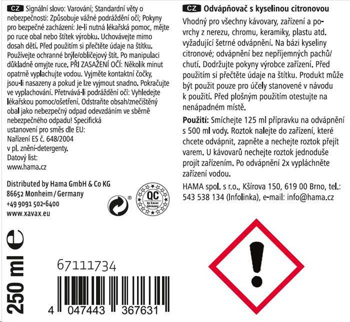- prípravok na rýchle odvápnenie - vhodný pre všetky zariadenia na prípravu čaju, kávy, pressa, kapslové kávovary, aj plne automatické kávovary, varné kanvice, rýchlovarné konvice, ponorné variče, hrnce, nerezové hrnce a panvice, drezy, povrchy z nerezovej ocele, chrómu, keramiky a plastu atď., ktoré vyžadujú šetrné odvápnenie - na báze kyseliny citrónovej: odvápnenie bez nepríjemných pachov/chutí - bezpečnostný uzáver proti náhodnému otvoreniu deťmi - objem: 250 ml - vyrobené v Nemecku Upozornenie: Dodržiavajte pokyny výrobcu zariadenia. Pred použitím si prečítajte údaje na štítku. Pred plošným použitím otestujte na nenápadnom mieste. Použitie: Zmiešajte 125 ml prípravku na odvápnenie s 500 ml vody. Roztok nalejte do zariadenia, ktoré chcete odvápniť, zapnite a nechajte roztok prejsť varením. Pri kávovaroch nechajte roztok jednoducho pretiecť zariadením. Po odvápnení 2x vypláchnite zariadenie vodou.