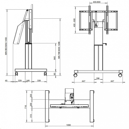 Stojan na televízory a monitory, ktorý má plne motorické nastavovanie výšky aj náklonu obrazovky, ovládanie pomocou ovládacieho panelu. Kedykoľvek môžete zmeniť výšku obrazovky v rozmedzí od 788mm až do 1288mm (výška od podlahy po stred obrazovky) a náklon obrazovky od 0° (obrazovka je zvisle) až do 90° (obrazovka je vodorovne) jednoducho a rýchlo stlačením tlačidla na diaľkovom ovládači. Konštrukcia televízneho stojana je profesionálnej kvality, zaviesť je možné televízory a monitory s hmotnosťou až 150kg.