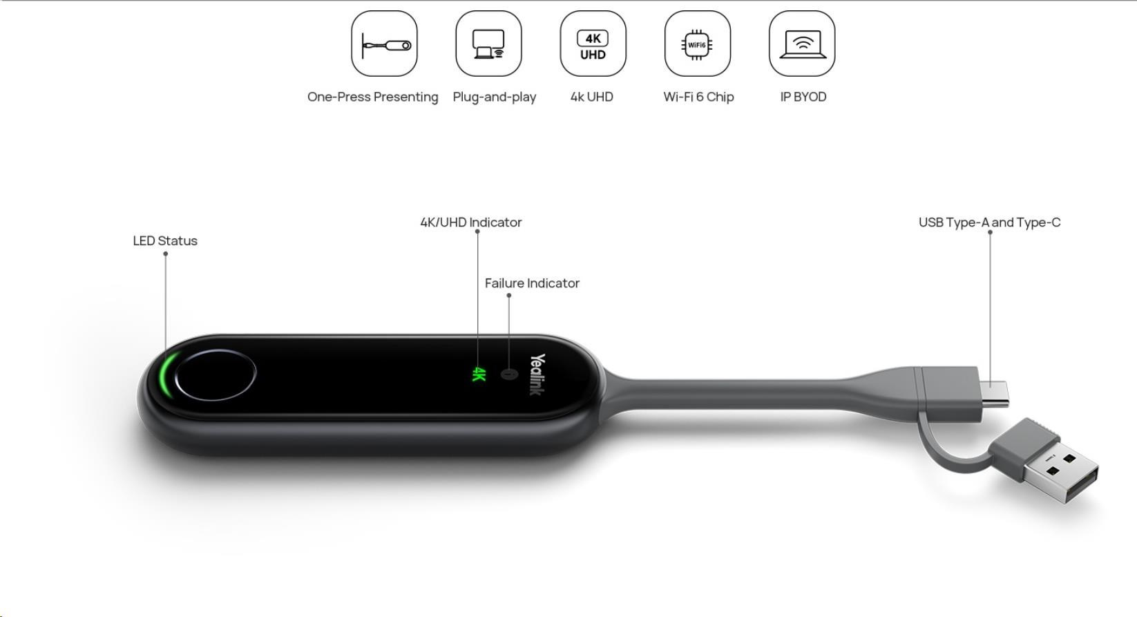 Yealink PA20 je nový 4K Ultra HD prezentačný asistent. Vďaka hardvérovému streamovaniu UHD až do 4K/30FPS PA20 ušetrí veľa úsilia tým, že odstráni nutnosť inštalácie softvéru alebo ovládačov. Port USB typu A / plne vybavený port USB typu C je vhodný pre rôzne počítače a telefóny. Pretože PA20 má vstavaný softvér pre prezentéra a Wi-Fi 6 čip, jednoducho pripojte PA20 k zariadeniu a môžete byť rýchlo pripravení na prezentáciu. PA20 vám poskytuje pohodlnejší a bohatší zážitok zo zdieľania obsahu.