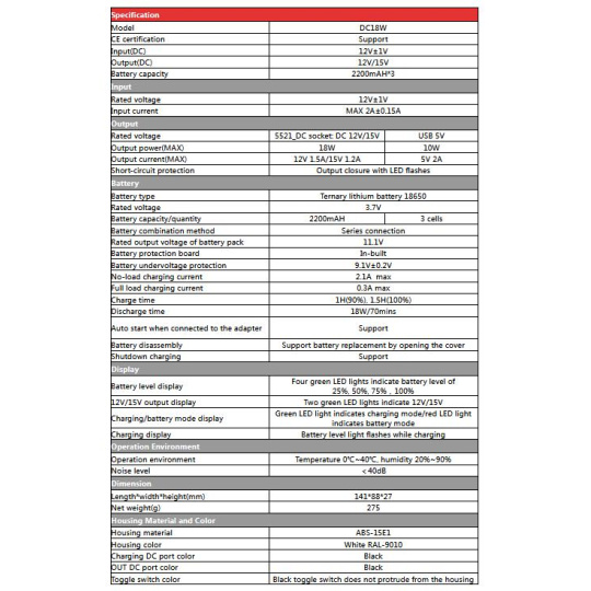 - indikácia: 4 stupňový LED indikátor stavu nabitia batérie, indikácia voľby 12V/15V, indikácia režimu Ups (zelená LED nabíjací mód, červená LED batériový mód)